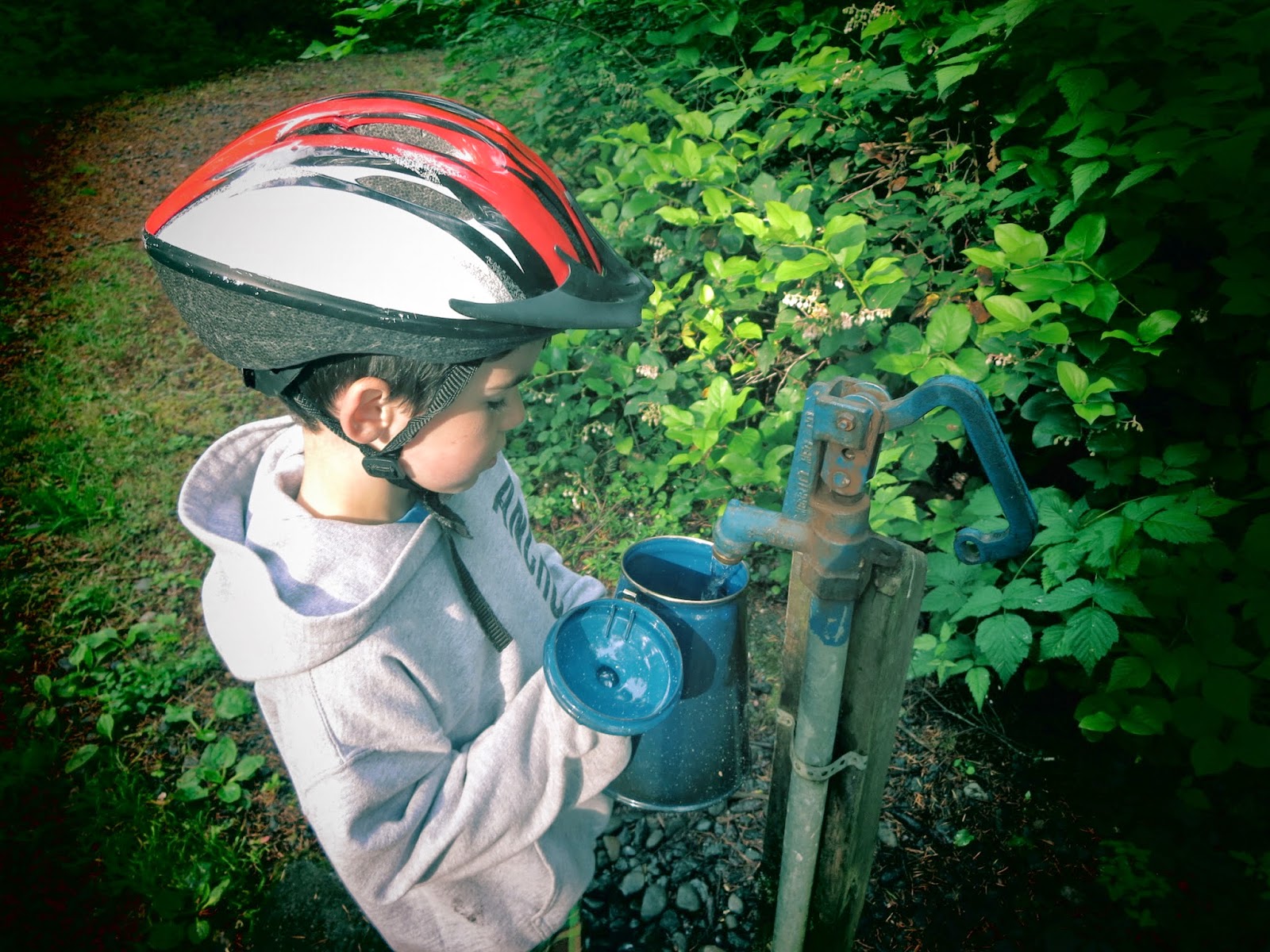 Owen loves to scoot around while camping, here he is going over the covered foot bridge, connecting the cabin sites to the cabin sites.